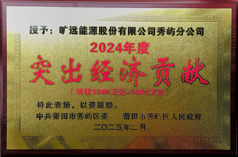 2025年1月 旷远能源股份有限公司仙游分公司被中共仙游县委、仙游县人民政府授予“2024年度突出经济贡献(纳税500万元-1000万元)”荣誉