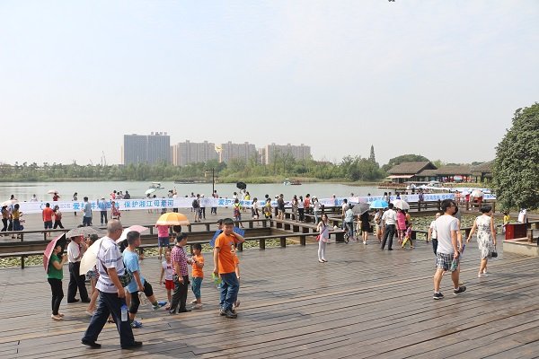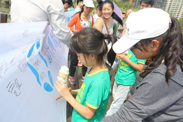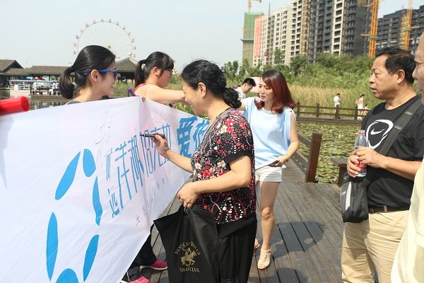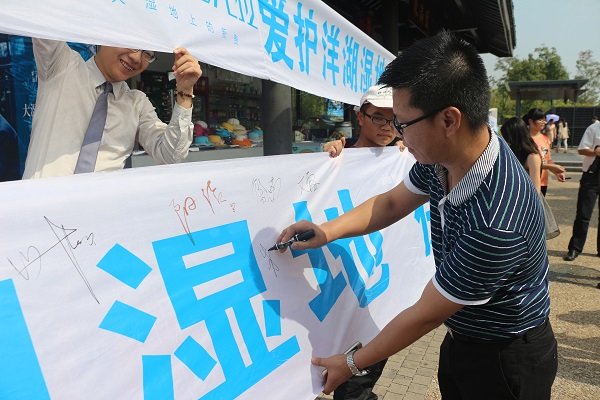 图为市民在”爱护洋湖湿地,保护湘江母亲河”横幅上签名